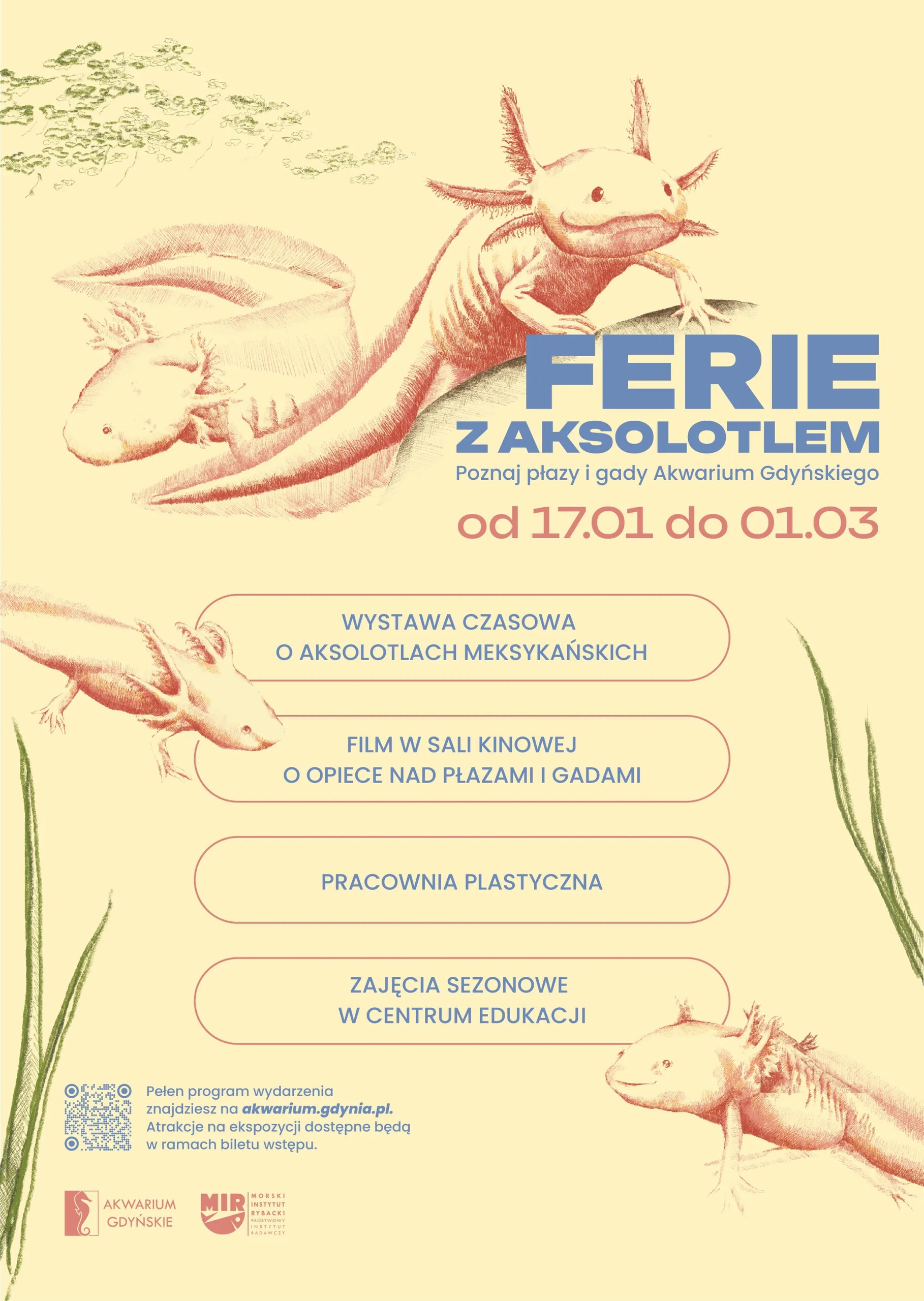 W okresie 17 stycznia – 1 marca 2026 r. Akwarium Gdyńskie zaprasza odwiedzających na specjalny program zimowy. Przygotowany został z myślą o młodszych, jak i starszych odwiedzających. Tegoroczne wydarzenia koncentrują się wokół świata płazów i gadów, a szczególną rolę odgrywa aksolotl meksykański – gatunek uwielbiany przez naszych gości.
