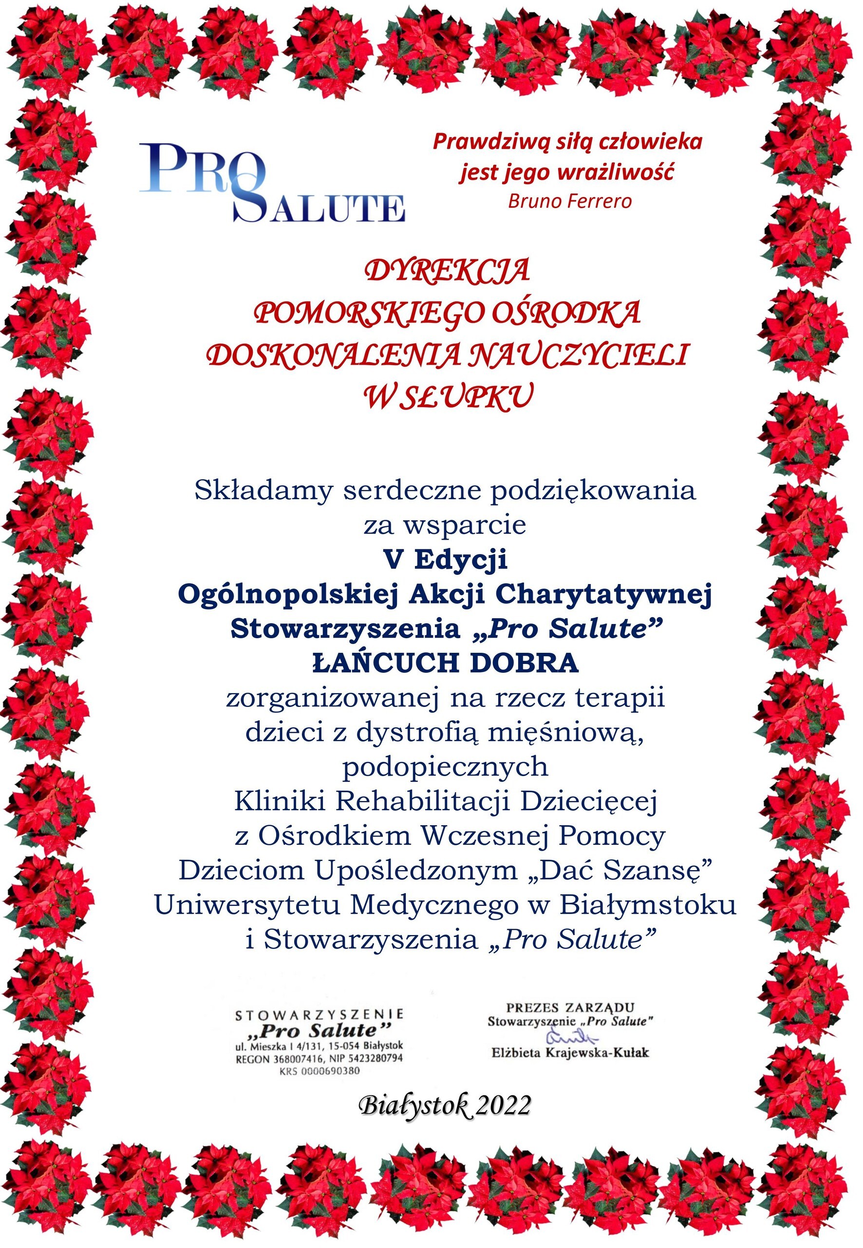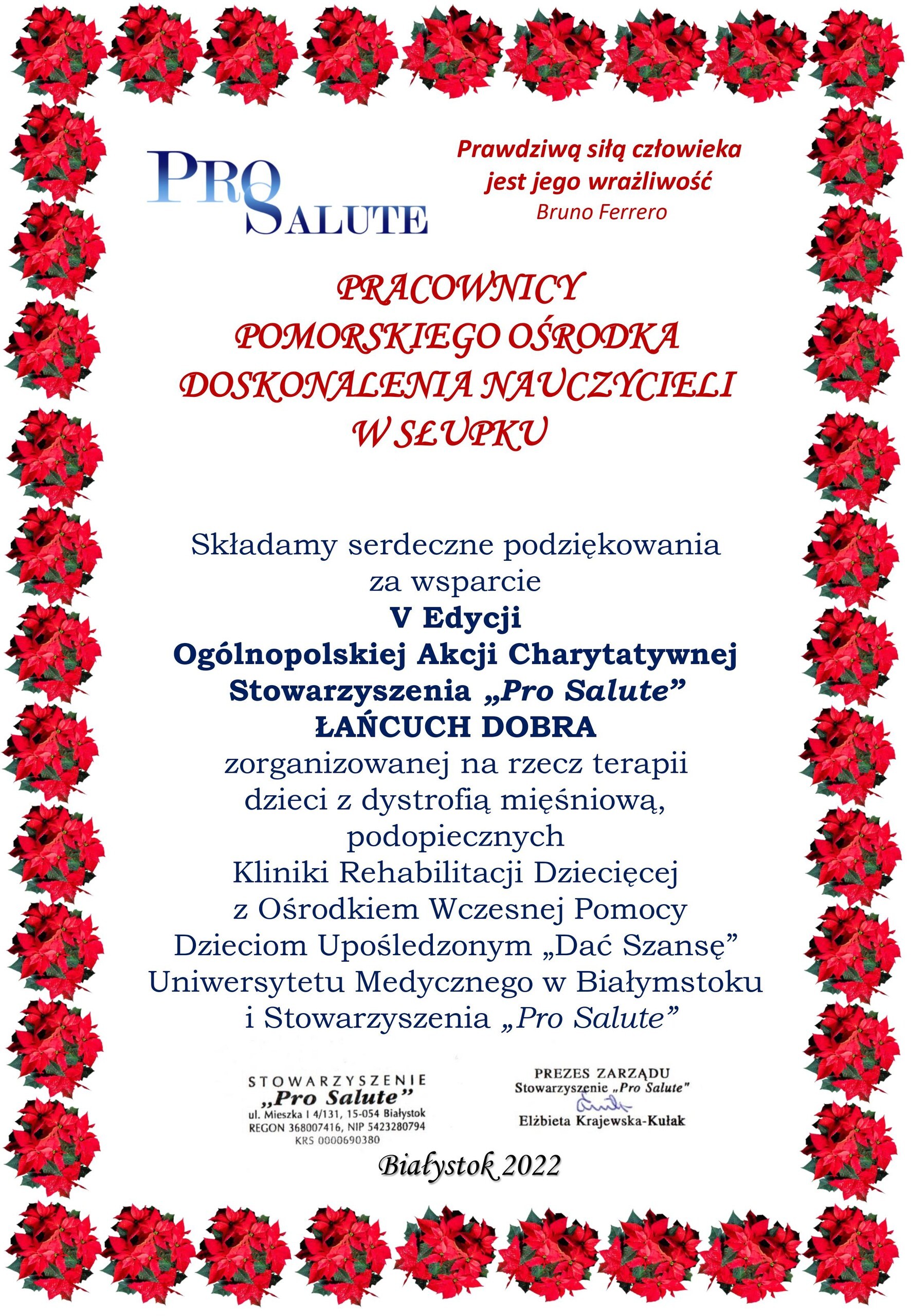 Pracownicy Pomorskiego Ośrodka Doskonalenia Nauczycieli w Słupsku - jak co roku - przyłączyli się do ogólnopolskiej akcji Stowarzyszenia Pro Salute "Łańcuch dobra". Była to już piąta edycja tego przedsięwzięcia.