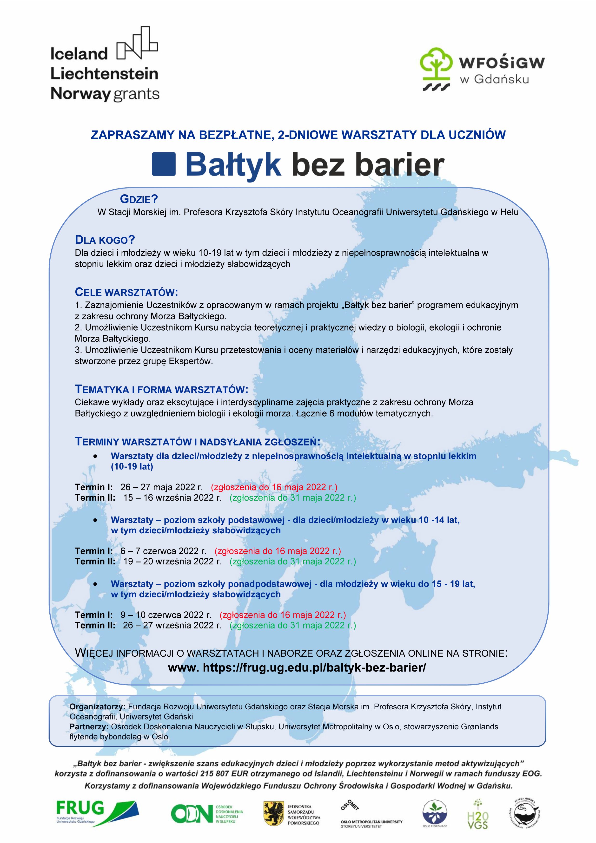 Fundacja Rozwoju Uniwersytetu Gdańskiego wraz ze Stacją Morską im. Profesora Krzysztofa Skóry Instytutu Oceanografii Uniwersytetu Gdańskiego serdecznie zaprasza uczniów w wieku 10-19 lat z ich nauczycielami/edukatorami z województw nadmorskich do udziału w bezpłatnych, 2-dniowych warsztatach organizowanych w ramach projektu „Bałtyk bez barier”.