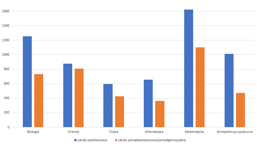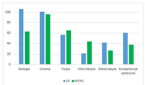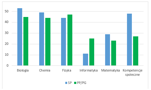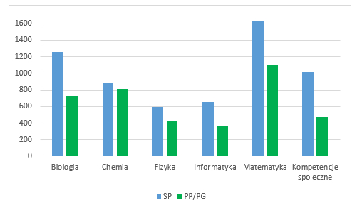 Najwięcej uczniów startowało w konkursie z matematyki, następnie z biologii,  chemii,  z przedmiotów rozwijających kompetencje społeczne oraz fizyki i informatyki (Ryc.2). Rozkład liczby uczestników ze SP i PP/PG z poszczególnych przedmiotów różnił się nieznacznie (Ryc.3). Największa grupa uczniów startowała w konkursie z matematyki zarówno ze SP, jak i PP/PG. Ranking uczestnictwa w konkursie dla SP oraz PP/PG przedstawiał się następująco: