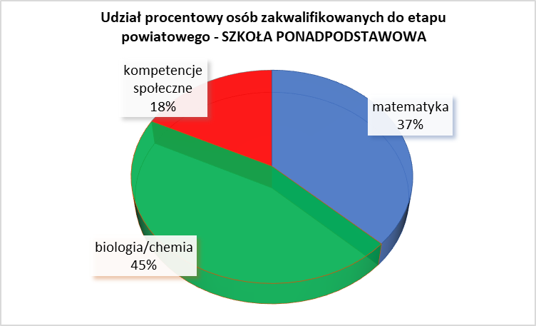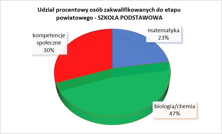 Do etapu powiatowego zakwalifikowano 534 osoby ze szkół podstawowych i 362 osoby ze szkół ponadpodstawowych. Najwięcej uczniów zakwalifikowano do konkursu z biologii i chemii.
