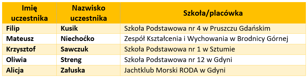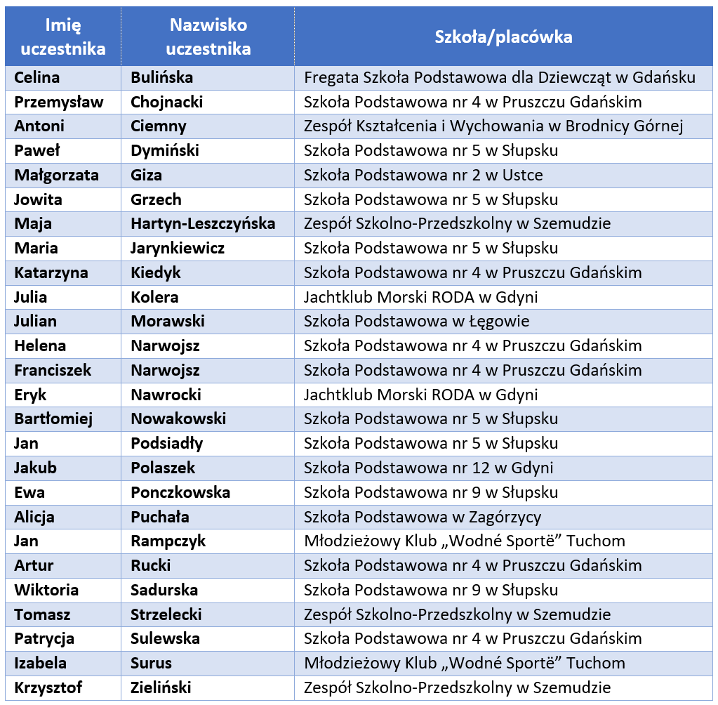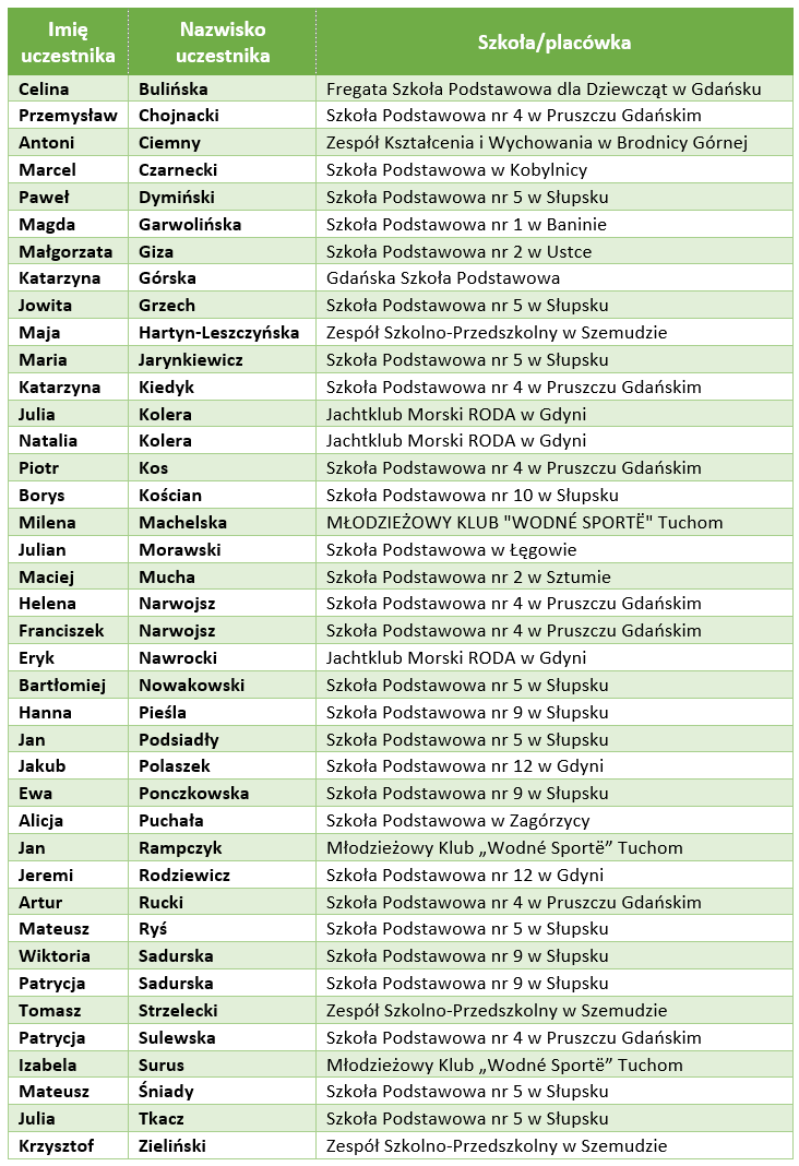 Lista uczniów z 40 najlepszymi wynikami uzyskanymi w etapie regionalnym - uczestnicy zakwalifikowani do udziału w wakacyjnych żeglarskich obozach edukacyjnych (nazwiska w kolejności alfabetycznej):