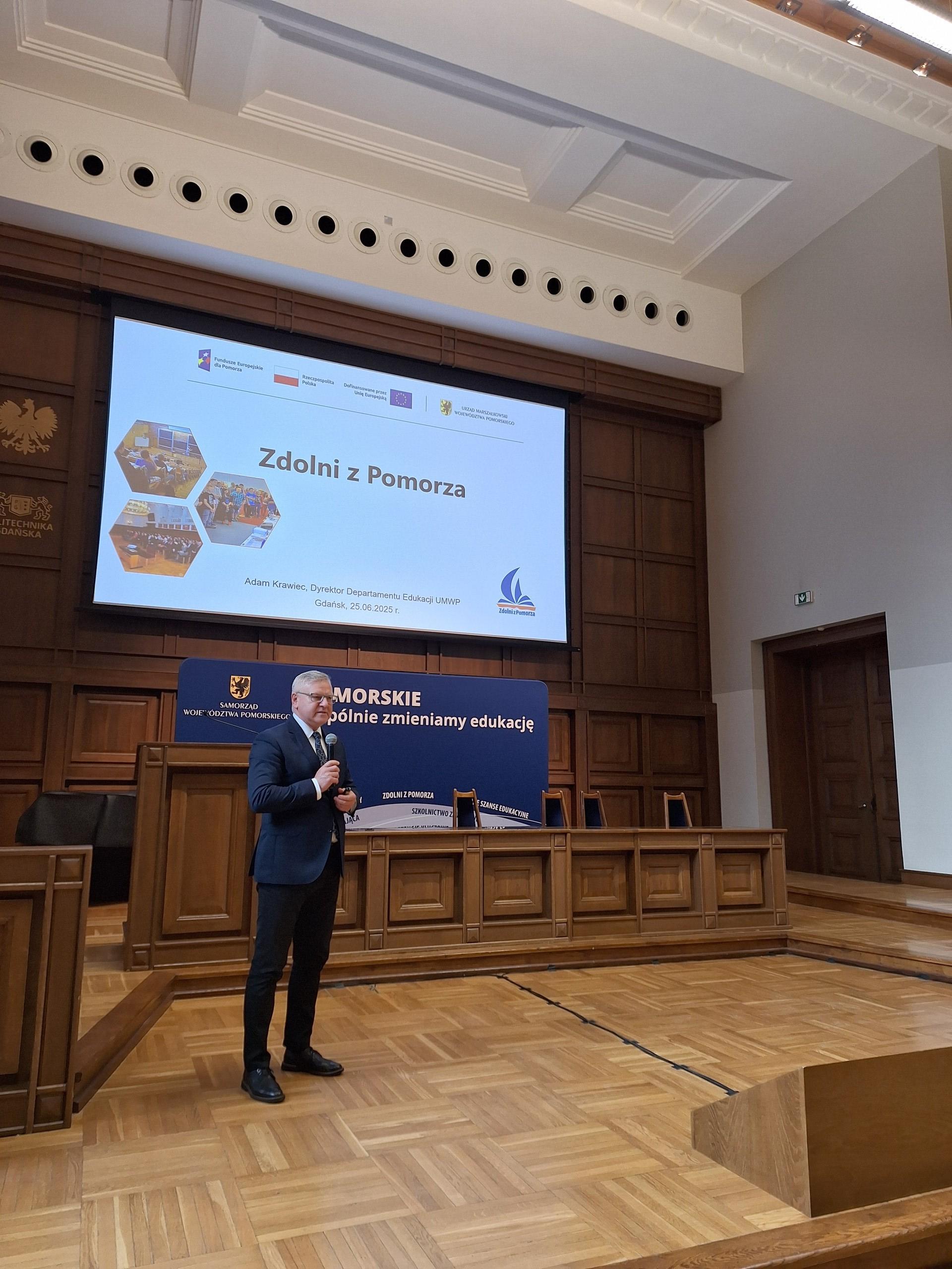 Oficjalnego podsumowania przedsięwzięcia strategicznego Zdolni z Pomorza w roku 2024/2025 dokonał Pan Adam Krawiec, Dyrektor Departamentu Edukacji Urzędu Marszałkowskiego Województwa Pomorskiego (UMWP).